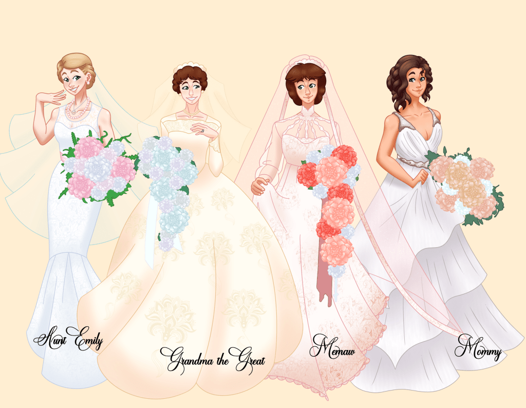 Professional artwork done for a client of them, their mother, and their daughters all in their wedding gowns